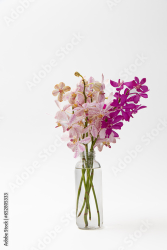 Orchids flower in glass bottle on in white background. Pink Purple Yellow Red light pink.Mokara Orchid.