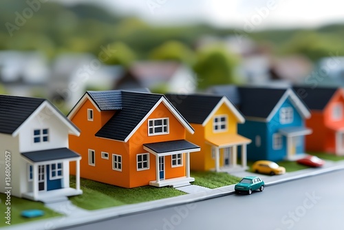 Orderly lineup of white and colorful modern suburban homes in real estate photography with a vivid orange home taking the central focus
