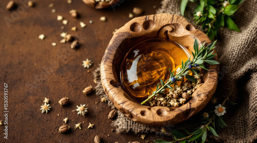 Organic Herbal Oil with Fresh Herbs in Rustic Wooden Bowl on Natural Background