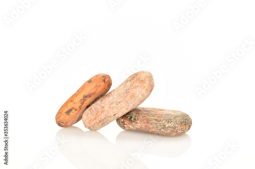 Organic, natural cocoa beans, close-up, on a white background.
