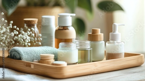 organic, spa, product, cosmetic, beauty, skincare, wellness, natural, bamboo, tray, bottle, jar, cream, lotion, oil, soap, container, wooden, towel, flower, plant, green, white, brown, clean, fresh, hygiene, health, pampering, relaxation, serenity, bathroom, home, decor, lifestyle, minimalism, calm, texture, soft