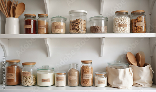Organized Kitchen Pantry with Glass Storage Jars, Wooden Utensils and Canvas Bags on White Shelves, Modern Minimalist Food Storage