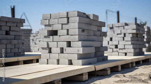 Organized stacks of grey concrete blocks dominate the construction site, suggesting industrial precision and the promise of future development.