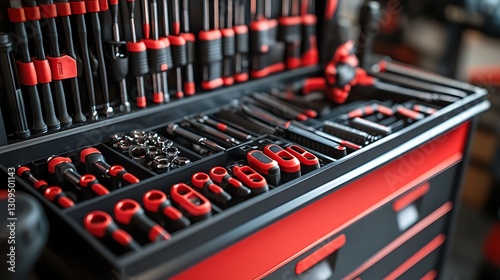 toolbox, tool, garage, repair, maintenance, mechanic, workshop, automotive, instrument, screwdriver, socket, wrench, spanner, hardware, equipment, repairing, fixing, bricolage, handyman, construction, car, truck, motorcycle, bicycle, home, work, storage, organised, professional, industrial, precision, quality, handy, toolshed, workstation, cabinet, closeup, detail, black, red