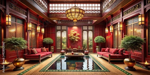 Oriental Oasis: Deep reds, golden accents, tatami mats, exotic luxury