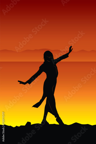 Original vector illustration. A girl on the background of a sunset, with her hair down and wearing glasses.