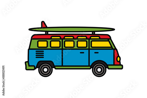 Original vector illustration. A van with a surfboard on the roof. A contour icon.
