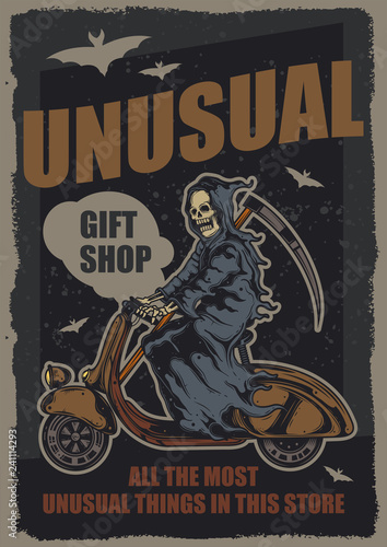Original vector poster. Skeleton with a scythe riding a scooter. Poster design.