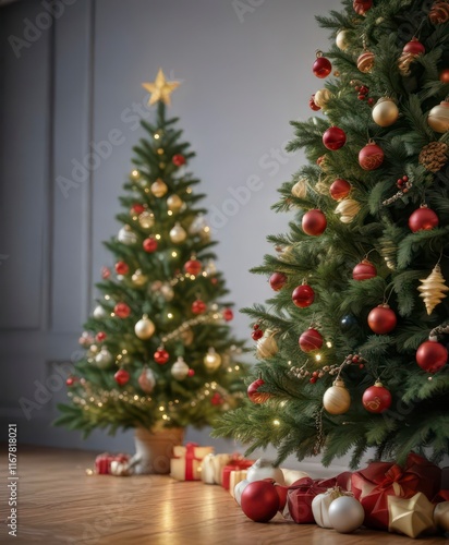 Ornamented Christmas tree branch with greenery and festive decorations, red, evergreen, holiday