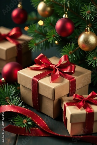 Ornaments and ribbons in craft gift wrapped around Christmas tree, cozy atmosphere, gift boxes, natural elements