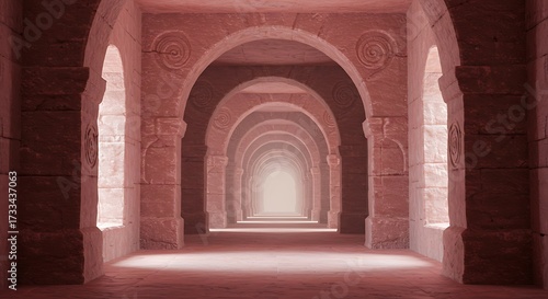 corridor, arch, architecture, interior, design, light, sunlight, perspective, render, rendering, red, stone, structure, pattern, building, classical, historical, ornate, symmetry, space, empty, hallway, passage, entrance, gateway, tunnel, shape, texture, surface, shadow, depth, composition, artwork, visual, graphic, illustration, digital, creation, artistic, aesthetic, element, background, concept, abstract, decorative, elegant, creative