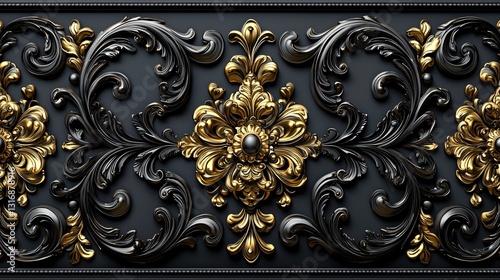 design, decorative, gold, black, pattern, ornate, relief, carving, texture, detail, luxury, elegant, vintage, baroque, classic, floral, symmetry, embellishment, molding, frame, border, wall, panel, style, art, architecture, room, interior, graphic, image, digital, three-dimensional, render, wallpaper, background, home, artistic