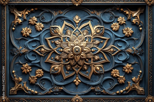 Ornate Blue and Gold Floral Relief Design on Dark Background