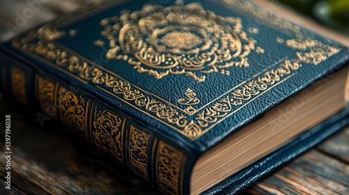 book, koran, islamic, religion, muslim, gold, design, pattern, blue, cover, education, culture, tradition, holy, text, script, paper, cognition, learning, read, study, belief, spiritual, religious, sacred, ornament, detailed, elegant, decorative, vintage, antique, old, ancient, history, historical, wood, wooden, table, surface, still life, macro, closeup, sharpened, detail, page, binding, library, classic, literature