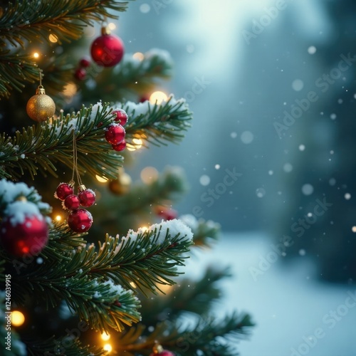Ornate Christmas tree branch with sparkling garlands and berries, holly, snowy scene