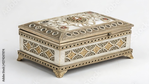 box, container, rectangular, ornate, decorative, silver, gold, metal, design, pattern, geometric, diamond, floral, white, background, isolated, studio, craft, craftsmanship, texture, surface, detail, element, object, antique, vintage, style, art, artistry, elegant, luxury, keepsake, storage, lid, latch, foot, border, inlay, engraving