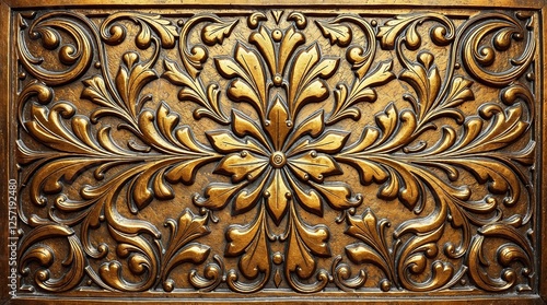Ornate embossed metal decor, intricate design, golden texture, lavish ornamentation