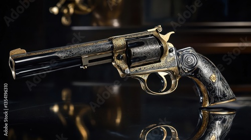 revolver, handgun, engraved, ornate, luxury, gold, black, firearm, weapon, handgun, collectable, antique, vintage, detail, craftsmanship, art, metalwork, gun, shooting, western, cowboy, classic, elegant, sophisticated, rich, expensive, macro, image