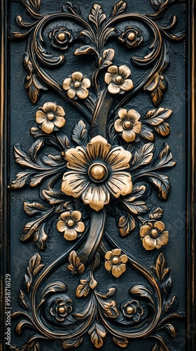 floral pattern, metal, black, gold, ornate, antique, vintage, pattern, texture, background, surface, detail, closeup, intricate, elegant, decorative, art, craft, design, metalwork, craftsmanship, historical, architecture, decor, embellishment, scrollwork, flourish, leaf, flower, symmetric, classic, style, traditional, luxurious, baroque, rococo, renaissance, gothic, engraving, relief, art deco