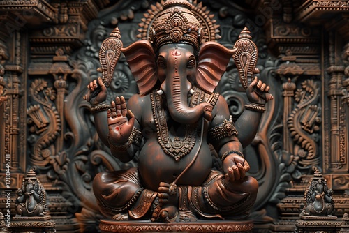 Ornate Ganesha statue, Indian temple, religious art, spiritual background