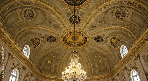 ceiling, ornate, gilded, architecture, chandelier, interior, design, historical, craftsmanship, islamic, pattern, light, art, luxury, dome, building, detail, decoration, elegance, complex, texture, arch, gold, embellishment, stucco, curve, motif, window, majestic, intricate, symmetry, baroque, beauty, palace, culture, ancient, arabesque, structural, geometric, traditional