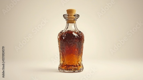 bottle, glasses, liquid, amber, cork, ornate, vintage, decorative, container, potion, brown, beige, still, life, craft, homemade, drink, beverage, fluid, transparent, light, shadow, textured, design, art, artwork, studio, tabletop, elegant, fancy, detail, vessel, filled, isolated, background, simple, plain, classic, old, antique, apothecary, medicine, remedy, elixir, sirup, infusion, cordial, extract