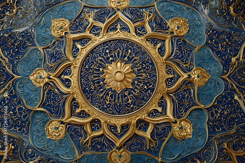 gold, blue, ornate, floral, medallion, intricate, pattern, decorative, traditional, islamic, art, design, texture, relief, detailed, symmetric, architectural, element, luxury, rich, deep blue, arabesque, calligraphy, geometric, motif, craftsmanship, cultural, heritage, interior, decoration, background, abstract, architecture, ornament, tile, mosaic, old, arabic, siam, mosque, thai, vintage, wall, ceiling, iran, door, style, antique