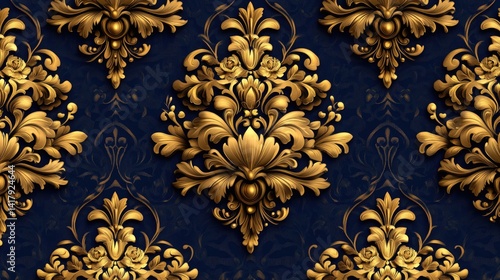 gold, ornate, floral, pattern, blue, design, decorative, elegant, luxury, repeat, symmetry, leaf, art, element, classical, baroque, detail, scroll, texture, flourish, vintage, wallpaper, rich, opulent, background, antique, style, motif, emboss, relief, flower, blossom, bud, droplet, bead, embellishment, swirl, curve, branching, arrangement, composition, dimensional, intricate, highlight, shadow, dark, light, depth