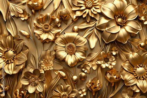 Ornate Gold Flowers Texture Pattern, Color Metallic Carved Floral Ornament 3d Imitation, Copy Space