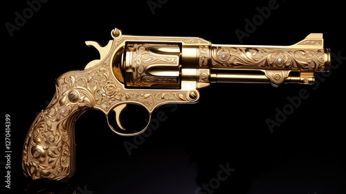 ornate, gold, gun, illustration, revolver, pearl, handle, opulence, sophistication, luxury, firearm, weapon, elegance, craftsmanship, design, metallic, shine, collector, unique, rare, valuable, antique, polished, decorative, masterpiece, artistry, premium, exclusive, lavish