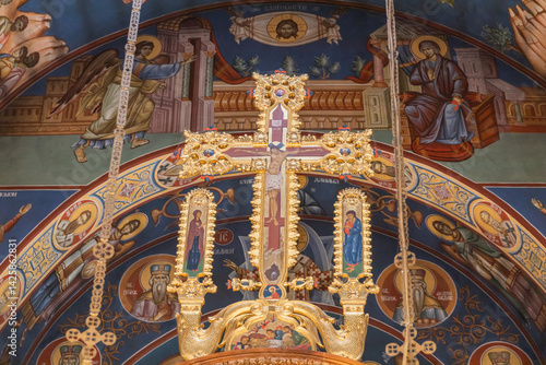 Ornate golden cross against a backdrop of religious frescoes in a Serbia Orthodox church interior, highlighting the artistic and spiritual elements of the space.