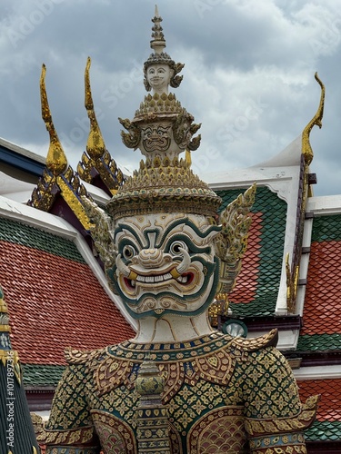 Ornate guardian statue at a temple with intricate details and vibrant colors.