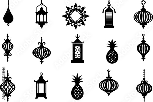 lantern, ornate, decorative, hanging, ornament, pendant, silhouette, intricate, detailed, pattern, design, black-and-white, graphic, vector, illustration, elegant, traditional, mystic, spiritual, vintage, antique, craft, art, unique, stylish, exotic, middle eastern, moroccan, arabic, islamic, christmas, holiday, festive, celebration, light, home decor, gift, abstract, delicate, pineapple, star, floral, droplet
