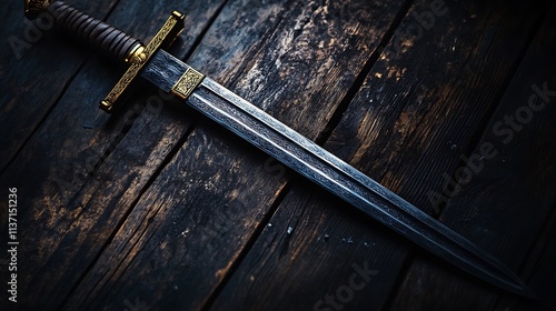 Ornate Medieval Sword Rests on Dark Wooden Surface