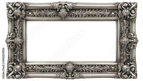 picture frame, frame, photo frame, silver, ornate, decorative, baroque, rococo, vintage, antique, classic, elegant, luxury, detail, border, isolated, white background, molding, carving, gilding, metallic