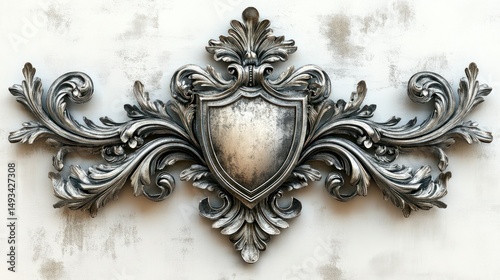 shield, emblem, ornament, decorative, metal, silver, antique, vintage, baroque, design, wall, decor, plaque, framing, accent, relief, three-dimensional, textured, background, pattern, scrollwork, foliage, floral, curl, classic, style, art, graphic, luxury, elegant, ornamental, detail, patterned, art deco, metalwork, engraved, crest, embossed, ornamentation, decoration, artwork, wallpainting, poster, graphic