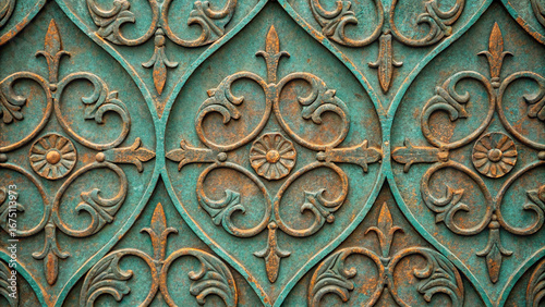 Ornate Teal and Copper Metalwork with Floral Patterns and Rust Texture iron wrought iron