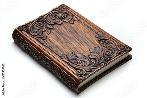 Ornate wooden book isolated on white background for journal, diary, or scrapbook use cases.