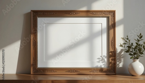 frame, wooden, picture, empty, surface, wood, sunlight, illuminate, greenery, plant, decor, interior, design, home, room, artistic, elegant, vintage, ornate, carved, detail, texture, light, shadow, white, background, style, aesthetic, minimal, photo, modern, image, blank, gallery, art, brown, natural, vase, leaf