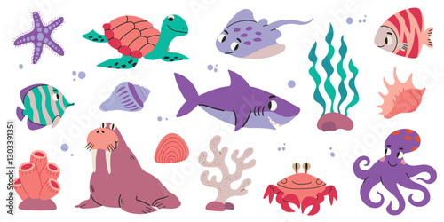 Основные RCollection set of sea and ocean underwater animals, corals and seaweeds. Cute little shark, crab, stingray, turtle, octopus, warlus and fishesGB