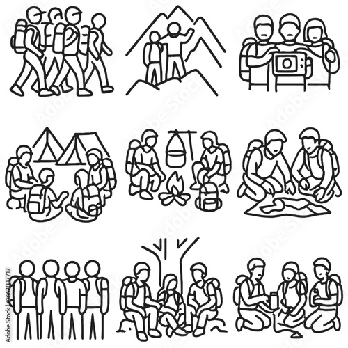 adventure, icon, line, style, group, activity, with, backpack, hike, pack, friends, mountain, top, photo, gear, team, campground, shared, cooking, setup, route, map, planning, crew, icon, trail