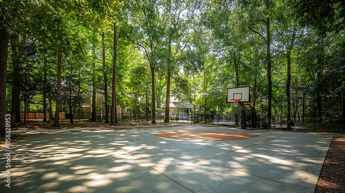 Outdoor court surrounded by trees with a basketball resting near the hoop
