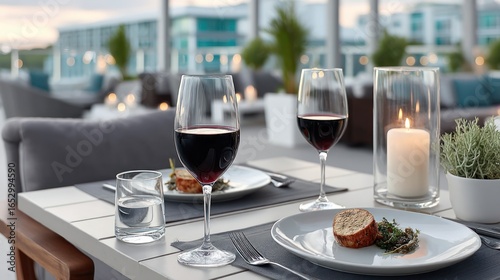dining, wine, food, candle, table, patio, eatery, drink, goggles, plate, cutlery, dinner, romantic, elegant, modern, luxury, setting, ambience, light, evening, sunset, view, architecture, sky, cloud, vegetation, plant, furniture, chair, contemporary, relaxation, meal, delicious, tasty, dish, wine glass, candlelight, refined, sophisticated, posh, life events