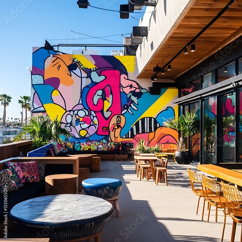 wallpainting, sitting, table, chair, stool, cushion, sofa, wood, surface, colourful, pattern, artwork, painting, bright, geometric, design, plant, palm tree, exterior, building, eatery, architecture, ceiling, speaker, structure, furniture, sunny, day, sky, clear, terrace, relaxing, lifestyle, social, gathering, event, commercial