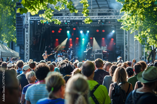 Outdoor music festival scene, highlighting a joyful crowd and the festive atmosphere of a live music event.