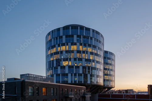 Outdoor night aerial top view at famous office building "Portland Towers Corporate Offices" in Copenhagen, Denmark.