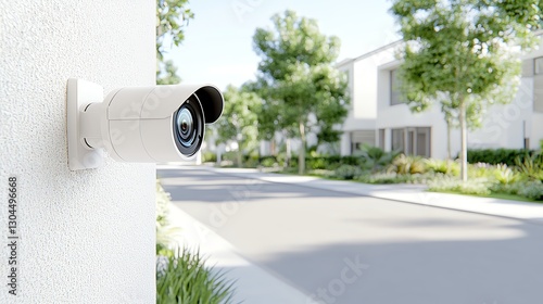 Outdoor security camera monitoring a peaceful suburban neighborhood with modern homes and greenery.