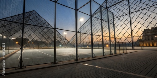 sport, court, dusk, sunset, twilight, evening, sky, cloud, netting, fence, geometric, structure, architecture, lighting, stadium, light, athletic, recreation, game, sport, activity, urban, city landscape, background, perspective, line, pattern, moody, dramatic