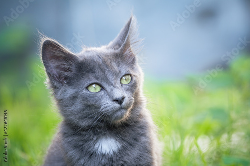 cat, portrait, kitten, outdoors, grey, pet, animal, cute, grass, domestic, felino, green, nature, fur, eye, cat, mammal, pet, eye, young, garden, animal
