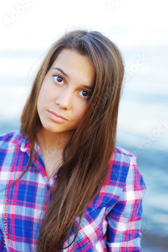Outdoors portrait of beautiful young brunette woman looking at camera